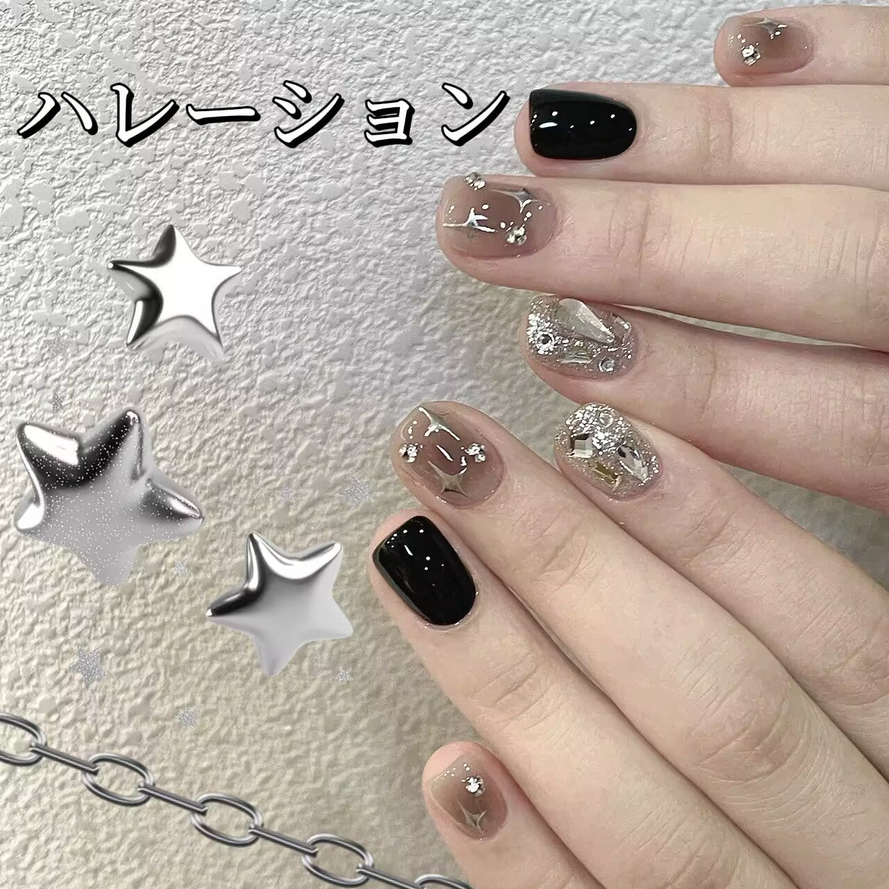 黒銀の星空の四芒星にめまいひらめきダイヤモンドを手でデザインして新しい短い台形を身に着け