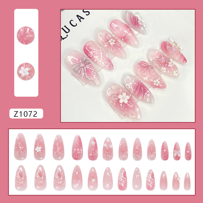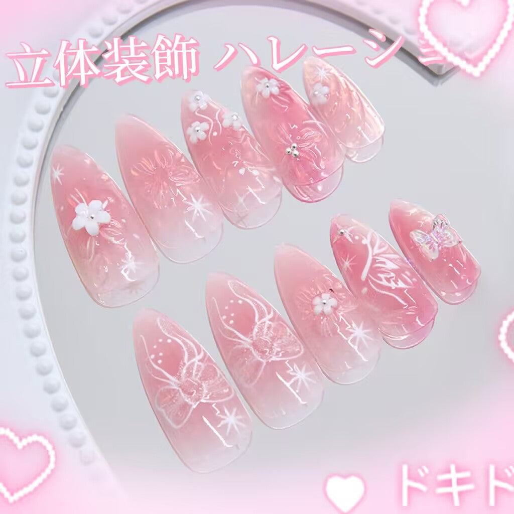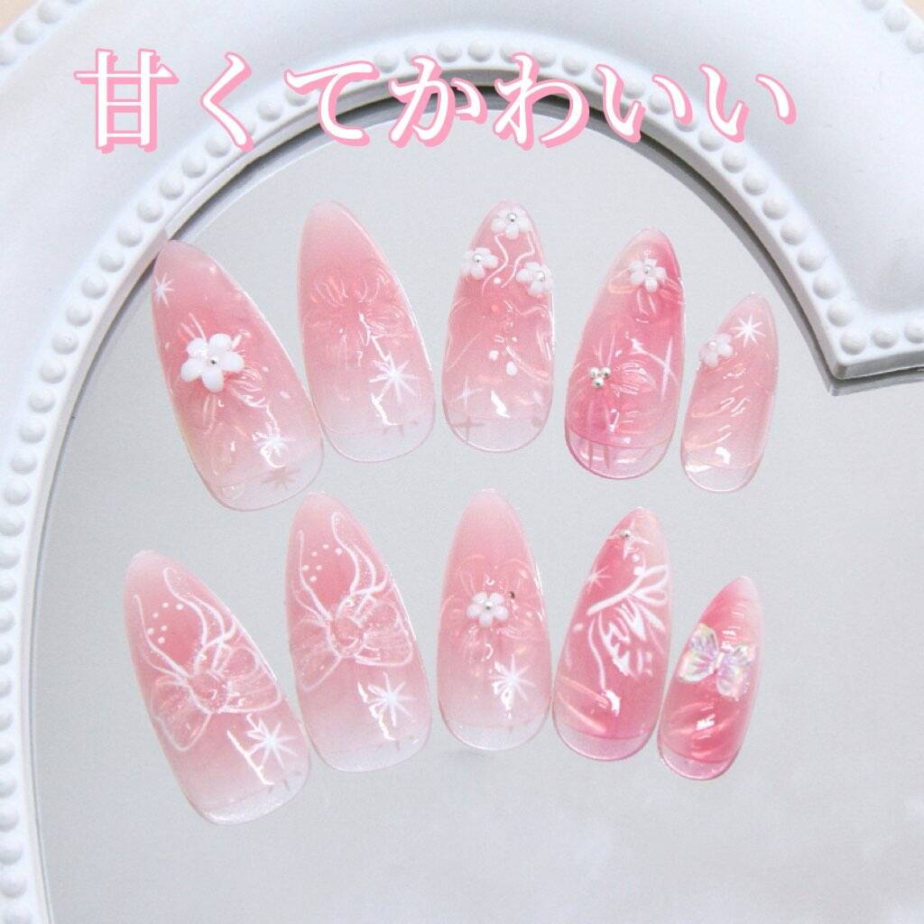 水蜜桃の夢の世界の立体猫の目氷の花めかして純手働の蝶の白い花装飾アーモンド型の甲を着用し