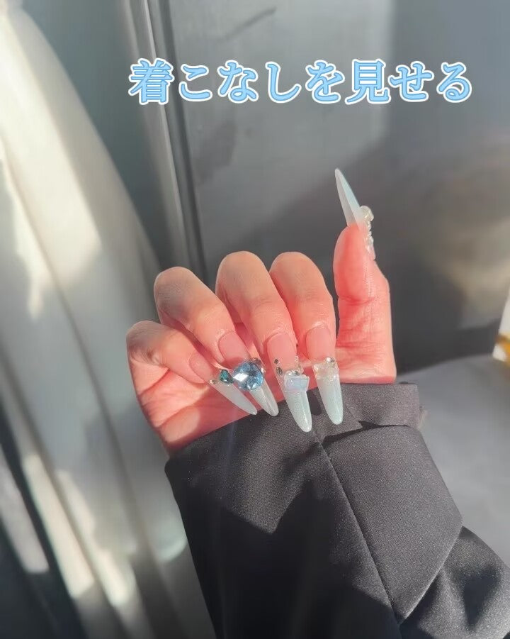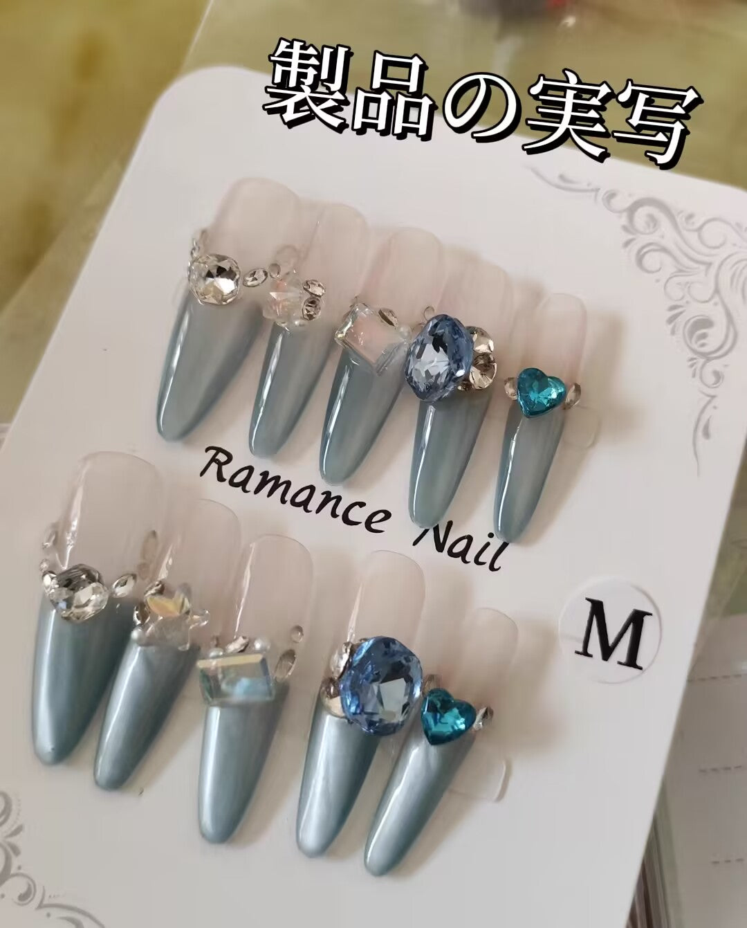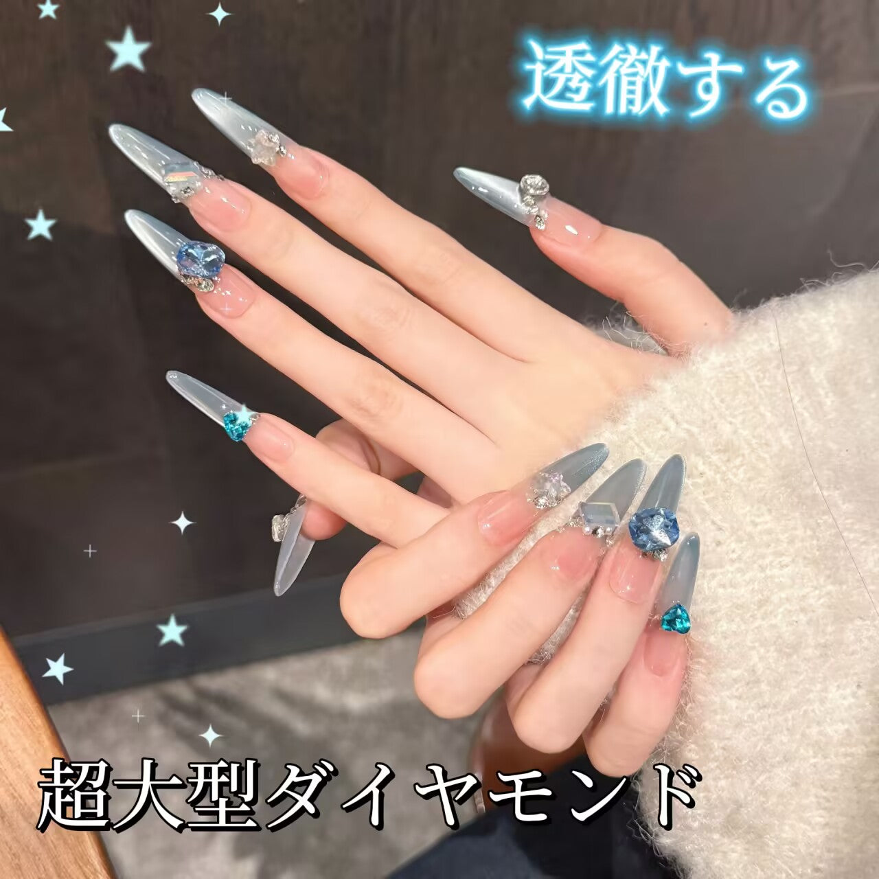碧藍海波漸変猫眼小砕鈷超特大藍色宝石爆閃光療超長細楕円着用甲